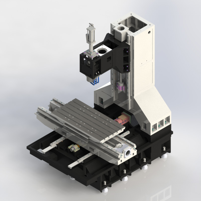 1.光机结构为定柱式,十字滑台结构。机身采用超大稳固底座,高刚性的大跨距人字形立柱,高速切削刚性好不变形;