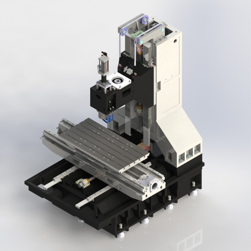 1.光机结构为定柱式,十字滑台结构;机身采用超大稳固底座,高刚性的大跨距人字形立柱,高速切削刚性好不变形;